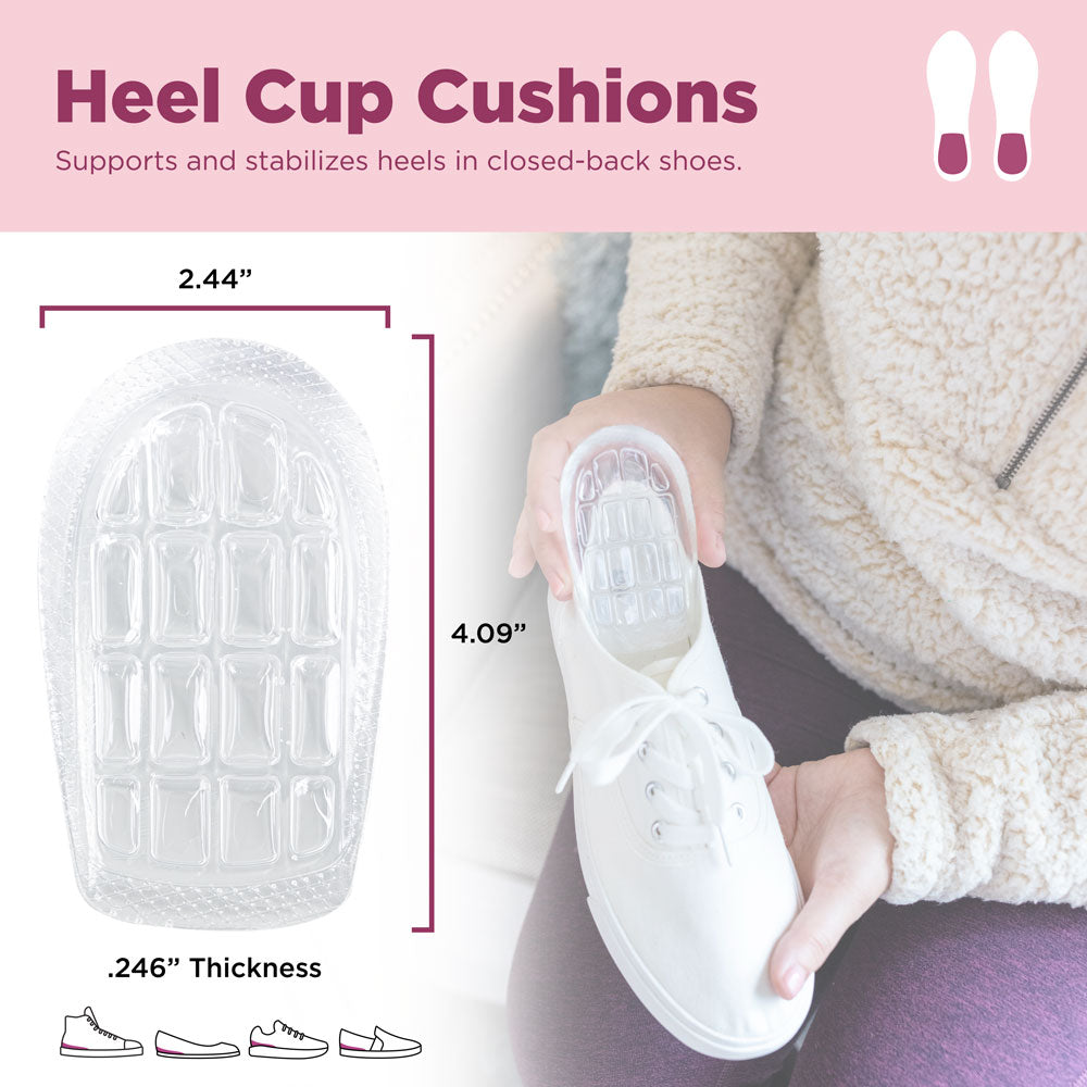 - Foot Petals Air Gel Heel Cup Cushions help prevent cracked heels and stabilize the heel in closed-back shoes