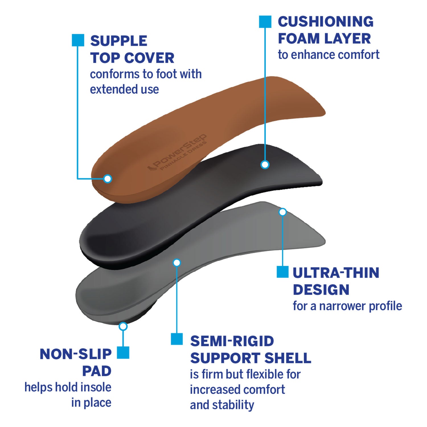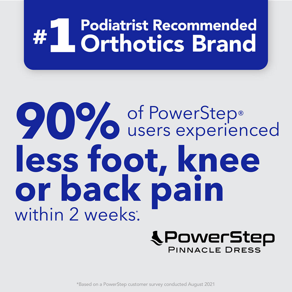 Feet with neutral arches naturally pronate when walking, where the feet and ankles roll slightly inward, placing pressure on the bigger toes and inside of the foot. Neutral arches need stable, yet flexible arch support for shock absorption and proper alignment. By combining premium cushioning and the clinically proven PowerStep arch shape in a firm but flexible neutral arch support shell, the PowerStep Pinnacle Dress shoe insoles are a trusted solution to improve foot function, decrease arch pain, and help alleviate common foot conditions typically caused by mild to moderate pronation.