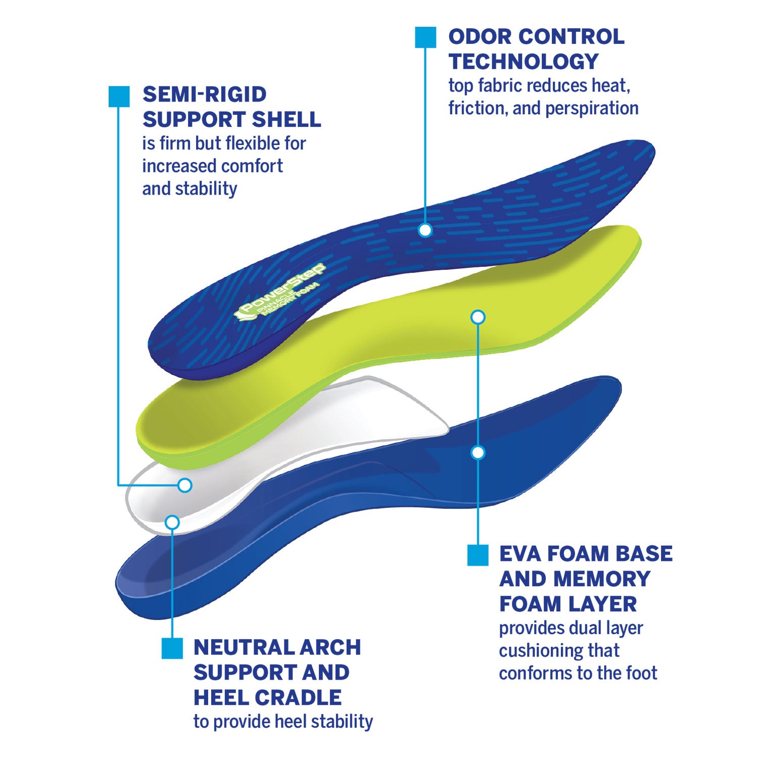 Feet with neutral arches naturally pronate when walking, where the feet and ankles roll slightly inward, placing pressure on the bigger toes and inside of the foot. Neutral arches need stable, yet flexible arch support for shock absorption and proper alignment. By combining premium cushioning and the clinically proven PowerStep arch shape in a firm but flexible neutral arch support shell, the PowerStep Pinnacle Memory Foam shoe insoles are a trusted solution to improve foot function, decrease arch pain, and help alleviate common foot conditions typically caused by mild to moderate pronation.