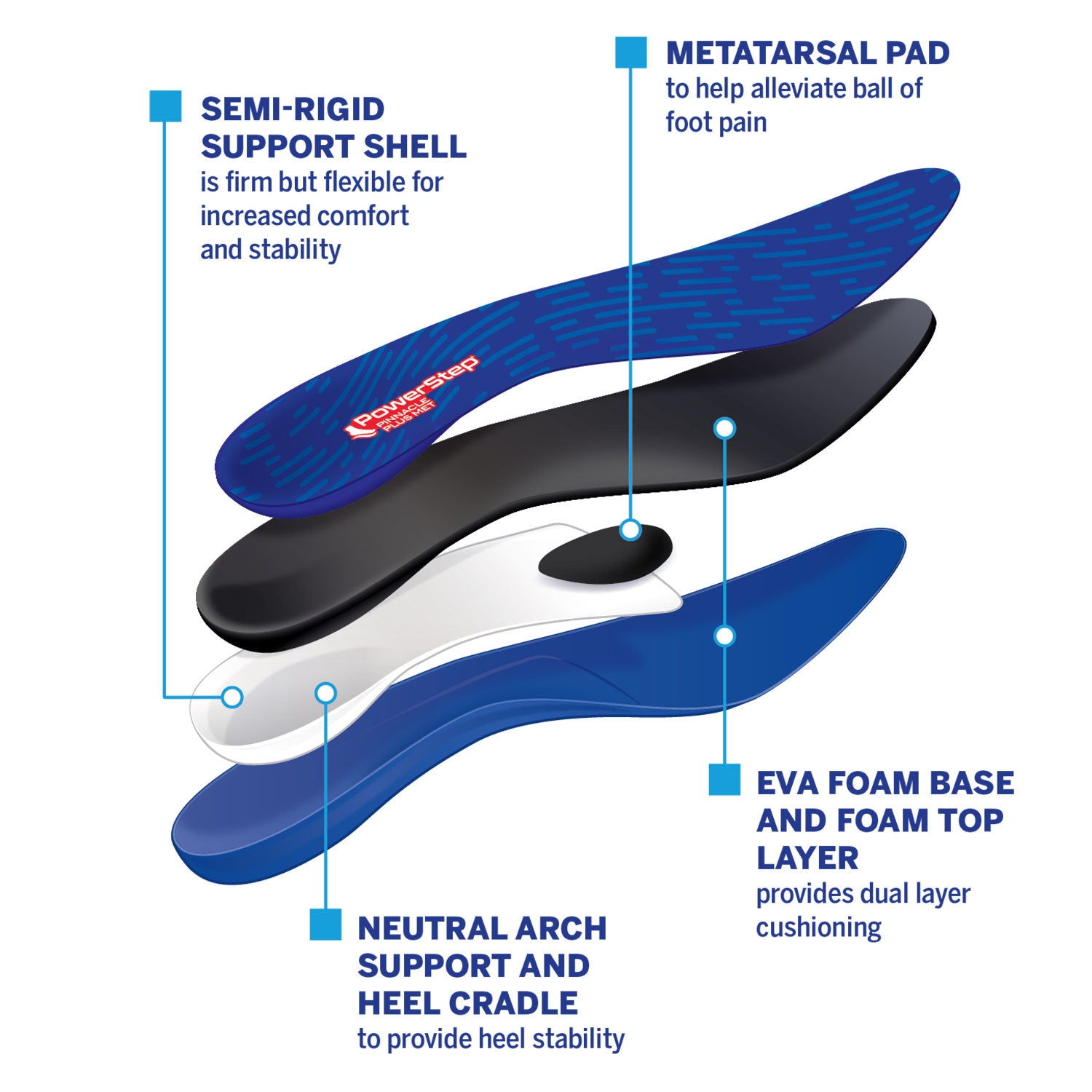 Feet with neutral arches naturally pronate when walking, where the feet and ankles roll slightly inward, placing pressure on the bigger toes and inside of the foot. Neutral arches need stable, yet flexible arch support for shock absorption and proper alignment. By combining premium cushioning and the clinically proven PowerStep arch shape in a firm but flexible neutral arch support shell, the PowerStep Pinnacle Plus Met shoe insoles are a trusted solution to improve foot function, decrease arch pain, and help alleviate common foot conditions typically caused by mild to moderate pronation.