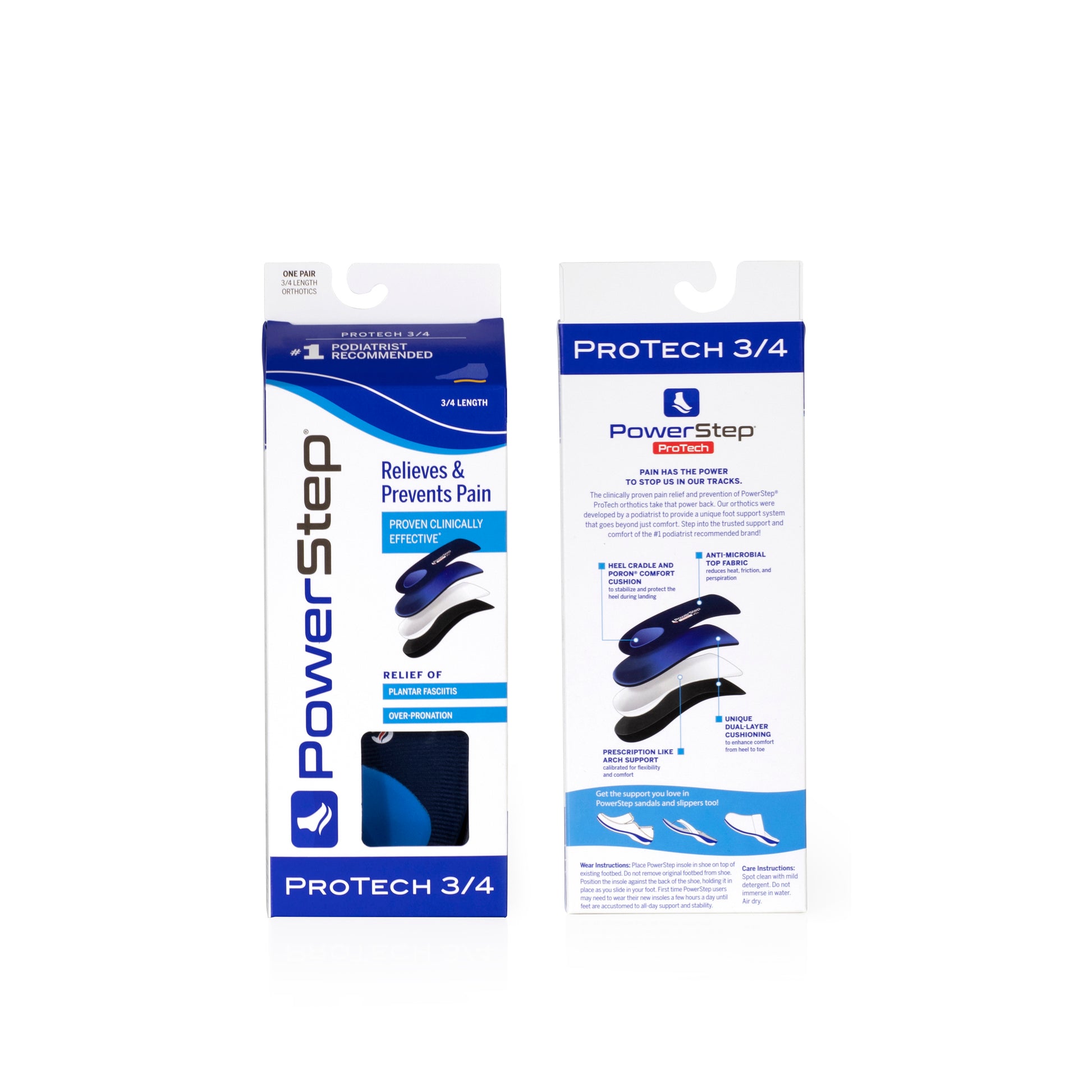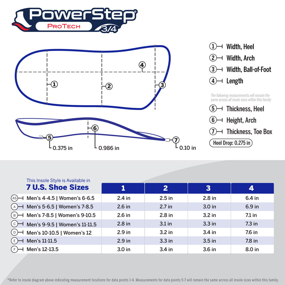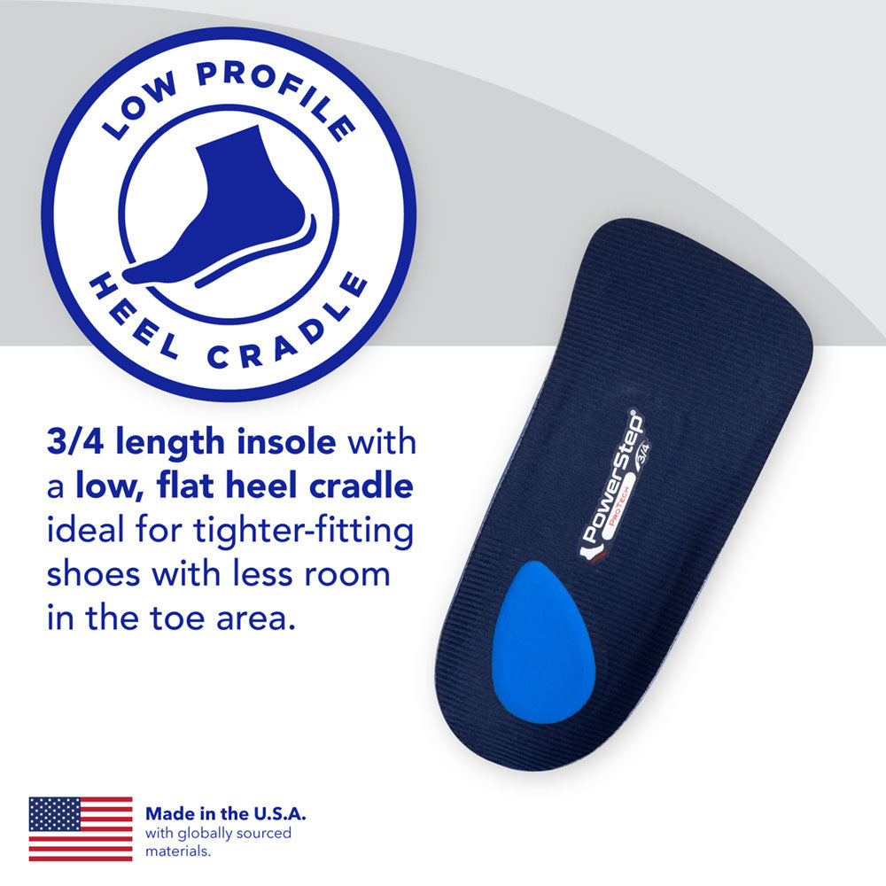 Designed for medical professionals, PowerStep ProTech 3/4 offers the same support as the ProTech full length style. The 3/4 is designed for tight fitting shoes that have a smaller toe box that does not have enough room for the standard ProTech insole. ProTech 3/4 is designed to sit on top of the existing OEM shoe insole, creating a solution that takes up zero toe box space.