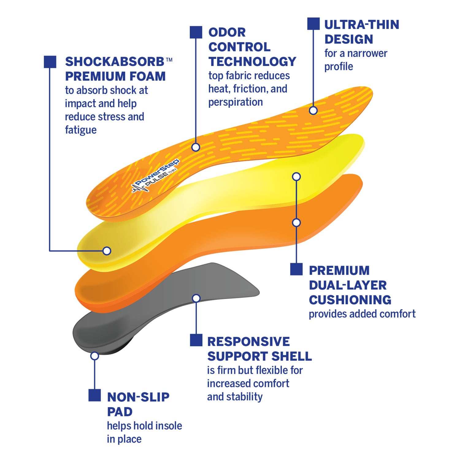 PowerStep® PULSE® Thin Insoles were designed by runners, for runners. Providing pain relief and prevention for the casual and the competitive, these running insoles feature a soft and springy layer of upgraded ShockAbsorb Premium Foam cushioning. The PowerStep PULSE Thin full length insoles are a lower profile design with a built-in neutral orthotic arch support and heel cradle that stabilizes the foot and improves alignment. The non-slip pad at the heel helps hold the orthotic in place. The PULSE Thin insoles feature the signature PowerStep arch shape but with a low, flat heel cradle adding stability and motion control. This motion control along with targeted dual-layer cushioning helps absorb shock at impact to reduce stress on the feet, ankles, joints, and tendons. The PULSE Thin running insoles provide the perfect blend of stability and cushioning during athletic activity to simultaneously increase comfort, help reduce fatigue and improve the efficiency of your stride.